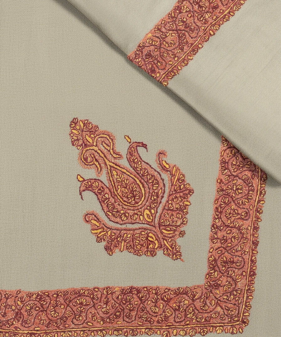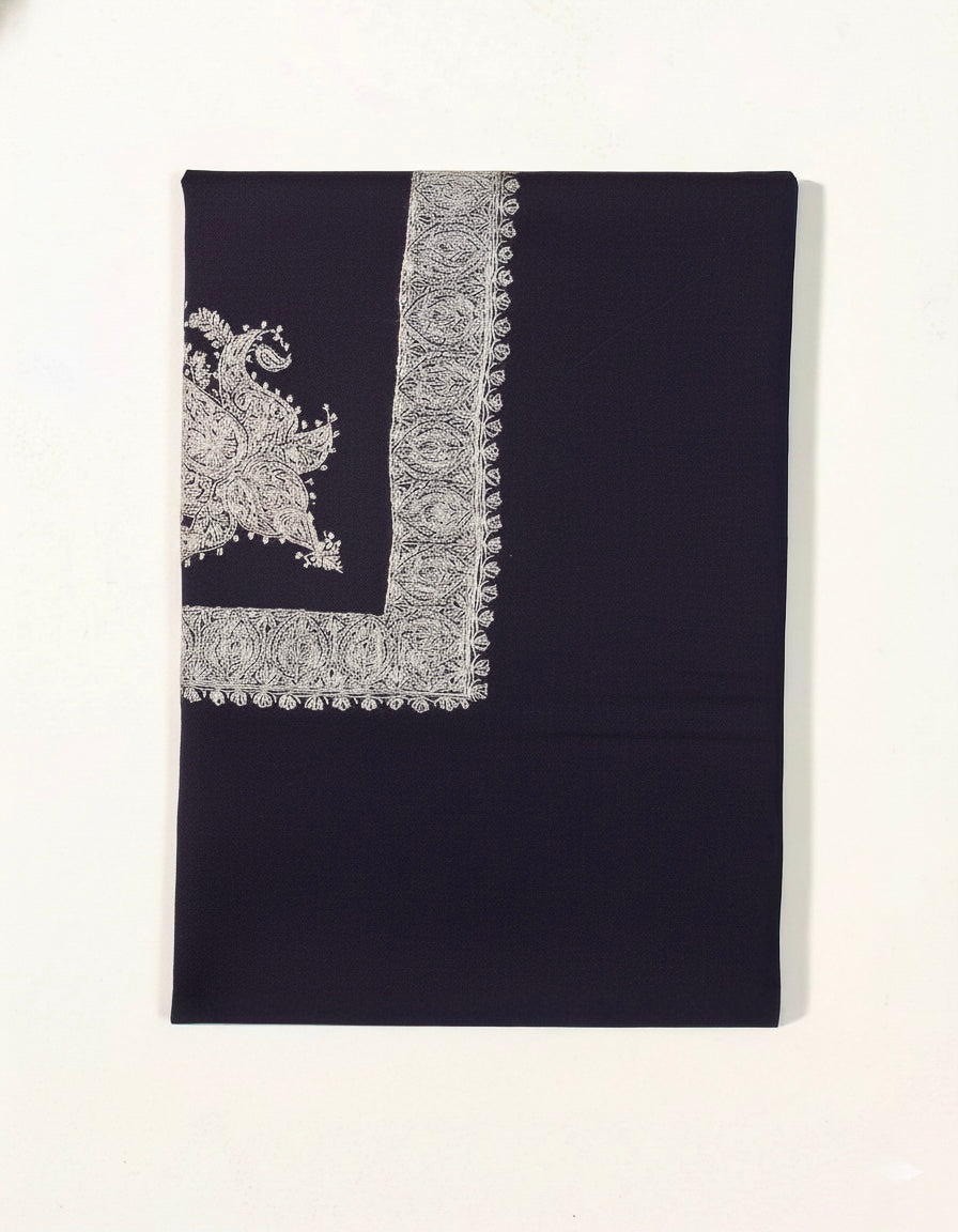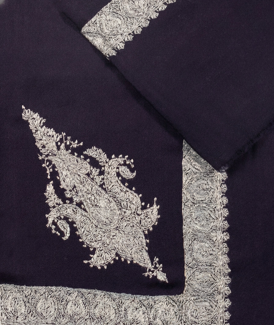 Pristine pure Belgium Pashmina shawl embroider upon by hand with intricate sozni neemdor design woven with utmost attention to detail