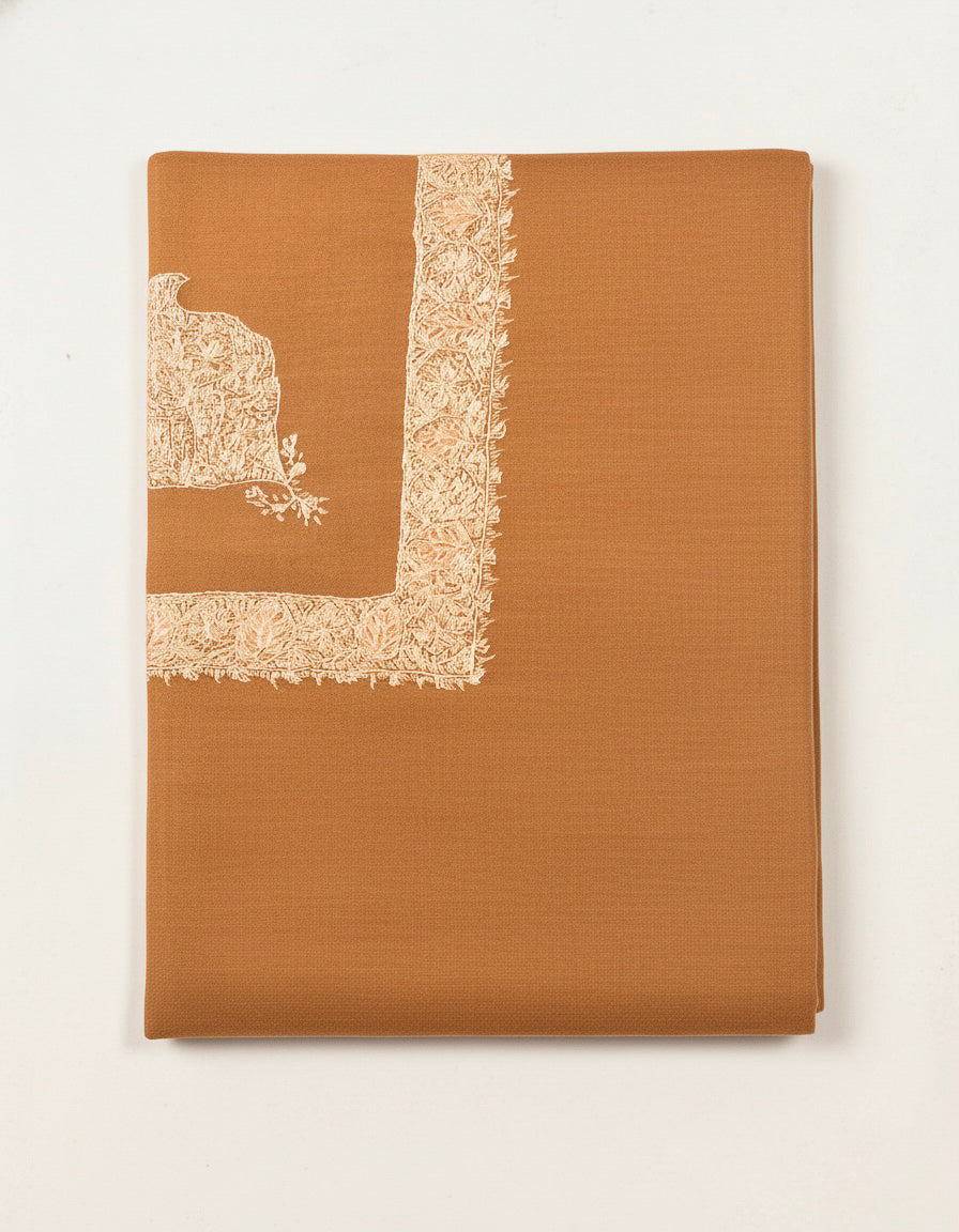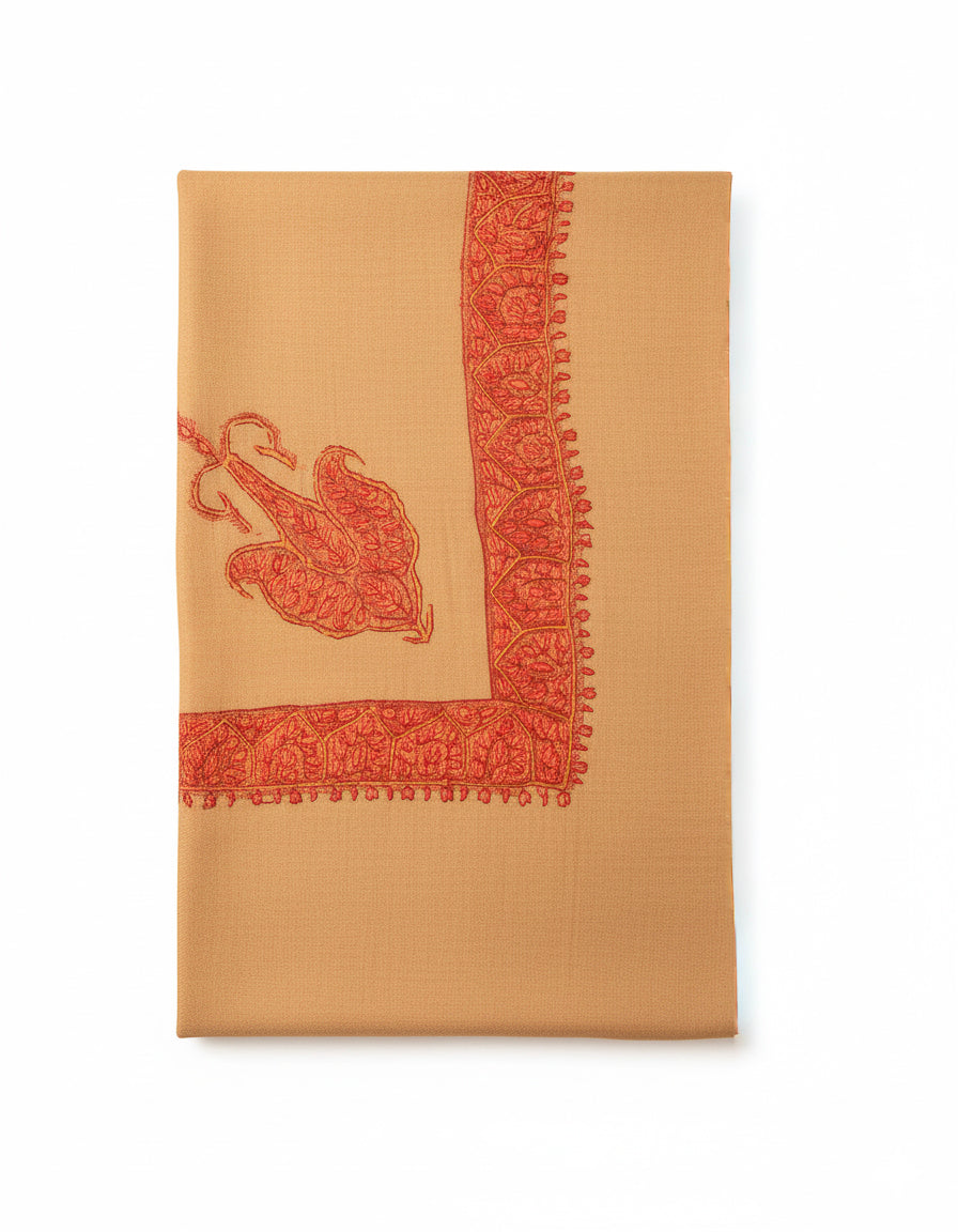This elegant hand wooven designer pashmina scarf has been painstalikgly embroided with centurioes old intricate sozni design all over it, making one love to witness a tangible cascade of fineness, refinemnet and royalty